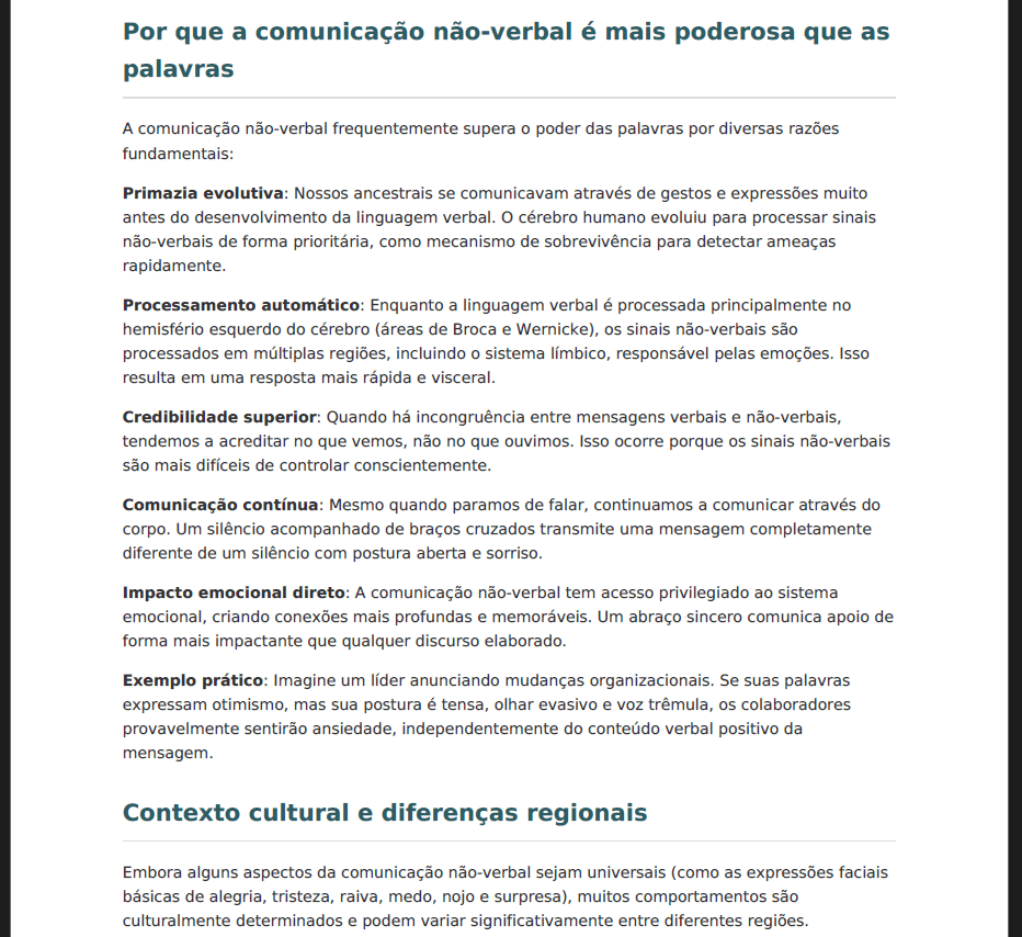Por fim, a sólida compreensão da comunicação não verbal multiplica influência e protege contra manipulação. Com voz ativa, transições fluidas — além disso, portanto, contudo, assim, finalmente — e exemplos reais, o livro entrega confiança para entrar em salas de reunião, palcos ou encontros transmitindo segurança antes mesmo de se apresentar.