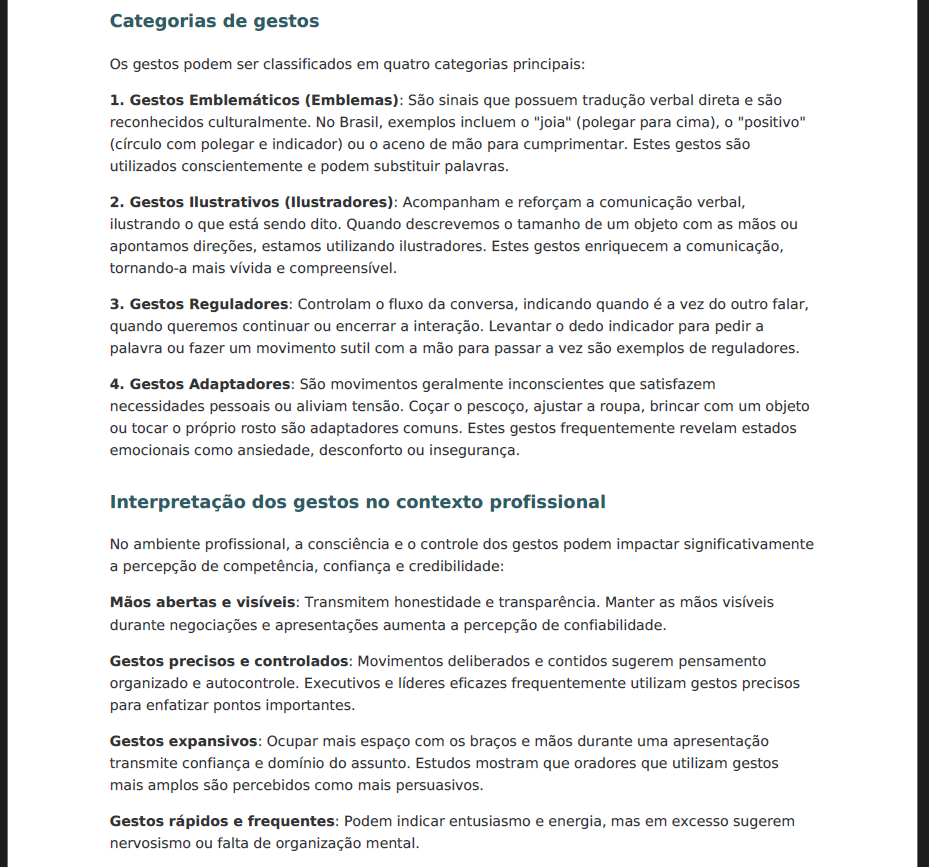 Você aprenderá, ainda, a alinhar gestos a argumentos de venda, calibrar contato visual em negociações e usar microexpressões para detectar objeções ocultas. Estudos de caso revelam líderes que elevaram a taxa de conversão em 25 % depois de ajustar linguagem corporal. Além disso, check-lists mensais acompanham avanço em credibilidade, empatia e impacto de apresentações.