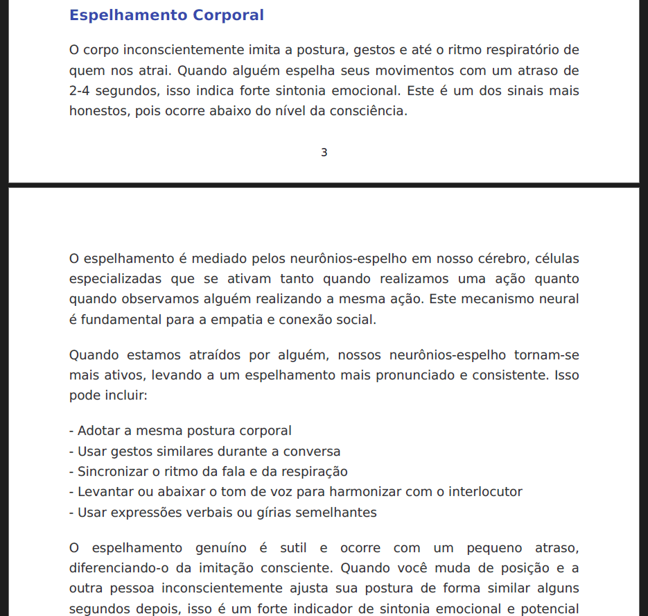 O pacote inclui o e-book extra Comunicação Não Verbal Romântica – Guia Essencial, que decifra sinais de interesse como olhar triangular, espelhamento sutil e toque prolongado. Planilhas de autoavaliação ajudam a distinguir atração genuína de simpatia casual, criando conexão sem parecer forçado. Ademais, exercícios de sincronização respiratória elevam a sensação de rapport em encontros.